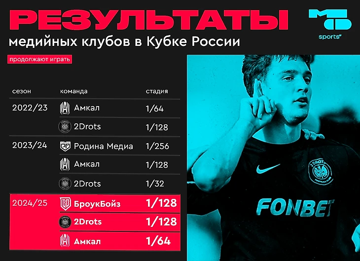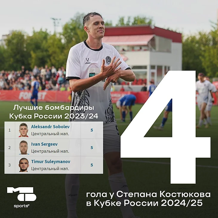 В этом сезоне у «Амкала» есть еще одно достижение – после игры с «Велесом» форвард Степан Костюков запрыгнул на первую строчку в списке бомбардиров Кубка России. У него четыре гола. Сезоном ранее лучшие бомбардиры Кубка – Александр Соболев, Иван Сергеев и Тимур Сулейманов – забили по пять. У 25-летнего Костюка в карьере были «Строгино» и владимирское «Торпедо», а с 2023-го он в Медиалиге.