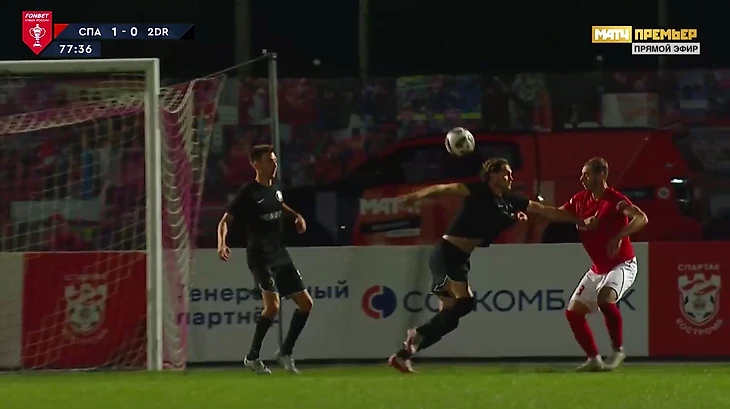 На 76-й минуте на замену вышел форвард Прош (Данила Прошляков). Его выпустили аккурат перед розыгрышем углового «Спартака». В борьбе с форвардом Ильей Рубцовым Прош отвлекся, махнул рукой, а в нее попал мяч. Выглядело неловко: Данила даже не смотрел на мяч, а боролся с Рубцовым.
