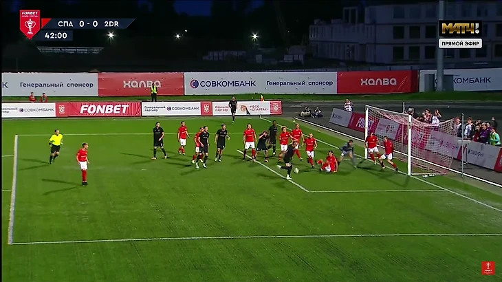 Самый острый момент 2Drots был у защитника Гудая (Дениса Гудаева) в конце первого тайма. После углового 2D кипер «Спартака» потерял ворота, Гудай пробил по пустым – но попал в защитника.