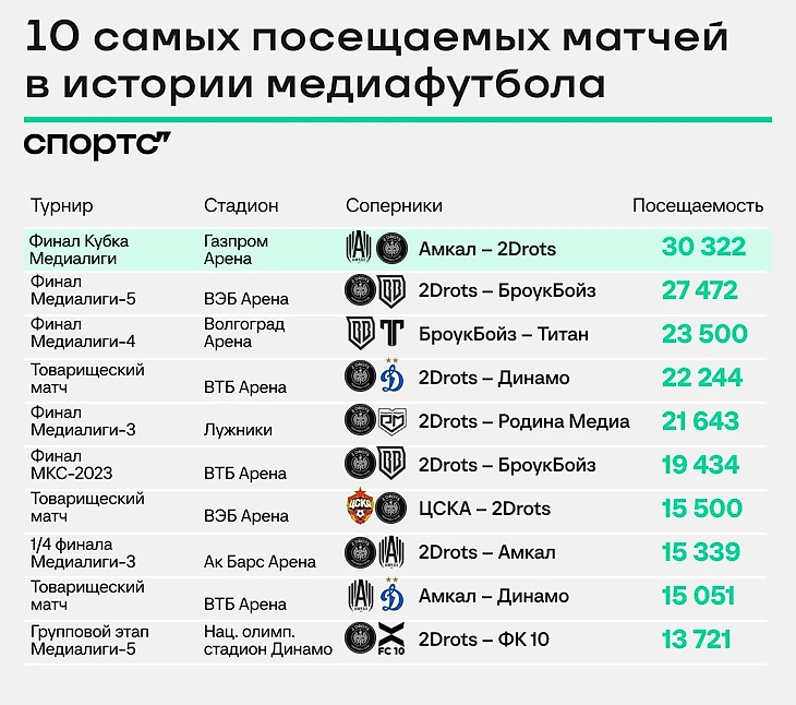 30 322 зрителя – рекорд медиафутбола. Предыдущий рекорд был установлен в июле этого года на финале пятого сезона МФЛ 2Drots – «БроукБойз» (0:3) на «ВЭБ Арене». Ту игру посетили 27 472 зрителя.