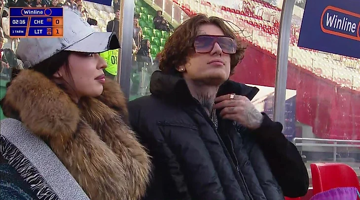 Инстасамка и Манекен расположились на бровке «Чертаново». Камера регулярно выхватывала звездную пару.