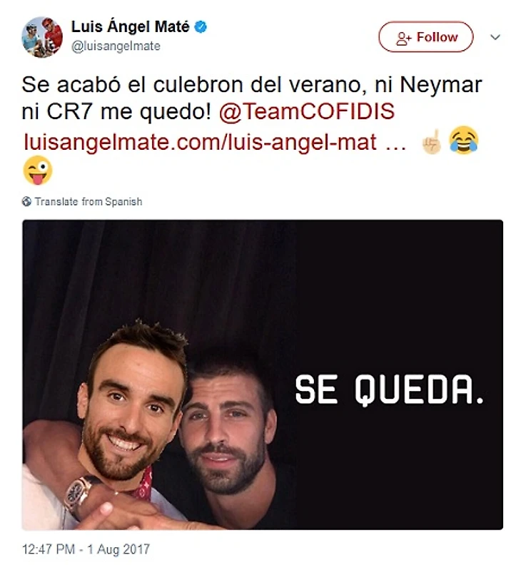 Испанский велогонщик Луис Анхель Мате сообщил о продлении контракта с командой Cofidis, спародировав футболиста «Барселоны» Жерара Пике.