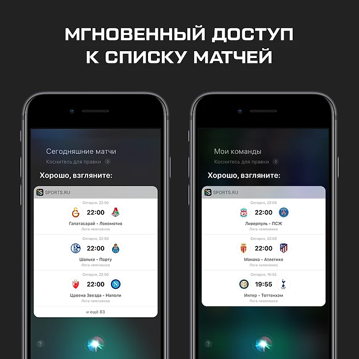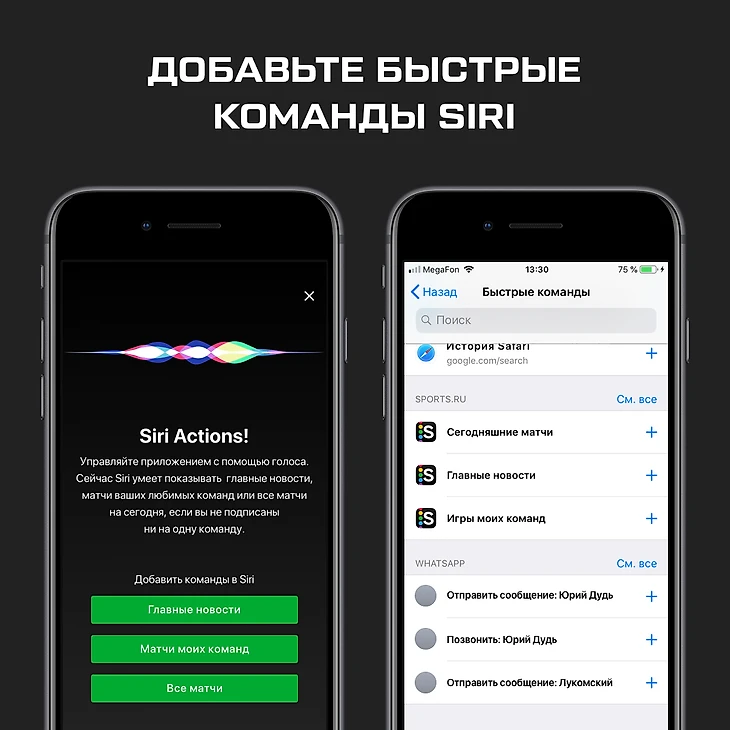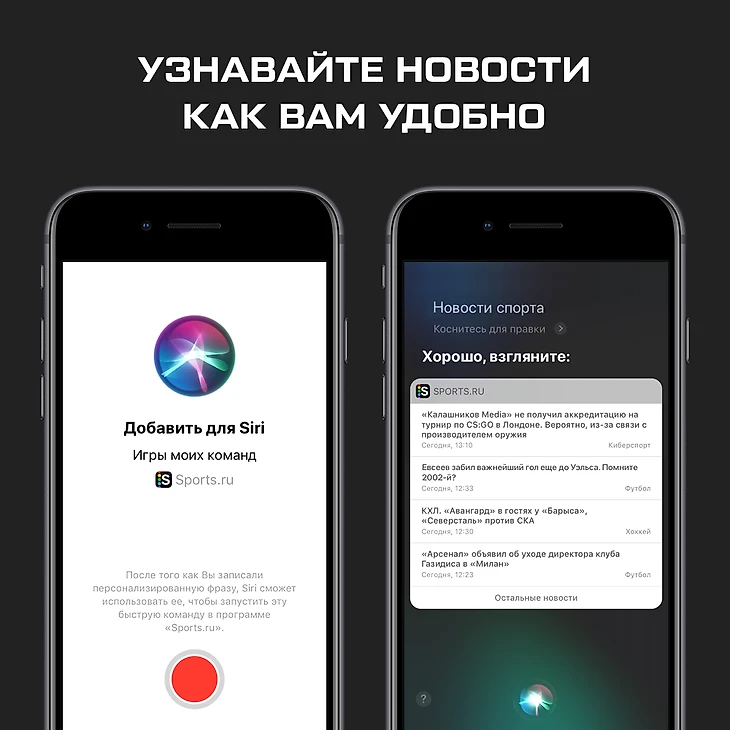 Запишите любое слово или фразу, при вызове по которым Siri покажет главные новости спорта, расписание ближайших матчей или результаты матчей ваших любимых команд.