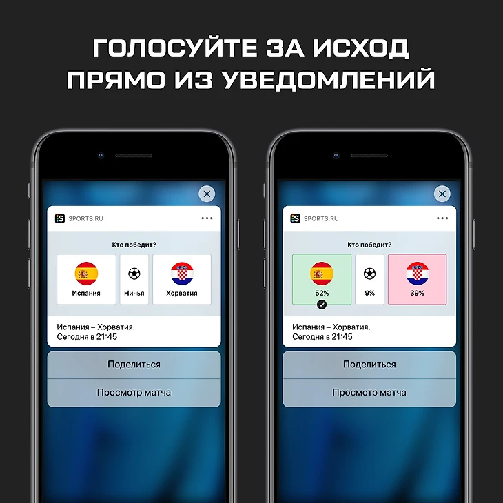 Теперь вы можете голосовать за исход матча прямо внутри push-уведомлений, не открывая приложение. Сделав свой выбор, вы сразу узнаете, кто, по мнению болельщиков, одержит победу в предстоящем матче.