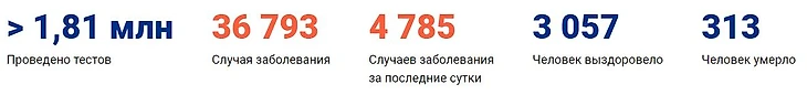 Обновление на 18 апреля 10:30 по московскому времени: в России зафиксировано 36 793 заражения COVID-19, 3 057 выздоровлений, 313 смертей, прирост зараженных за сутки составил +4 785.