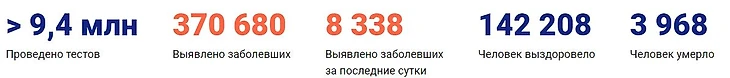 Обновление на 27 мая 10:35 по московскому времени: в России области зафиксировано 370 680 заражений COVID-19, 142 208 выздоровлений, 3 968 смертей, прирост зараженных за сутки составил +8 338.