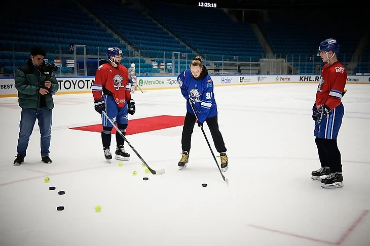 Теннисистка пожелала команде удачи в предстоящих матчах, а игроки подарили Рыбакиной хоккейный свитер.