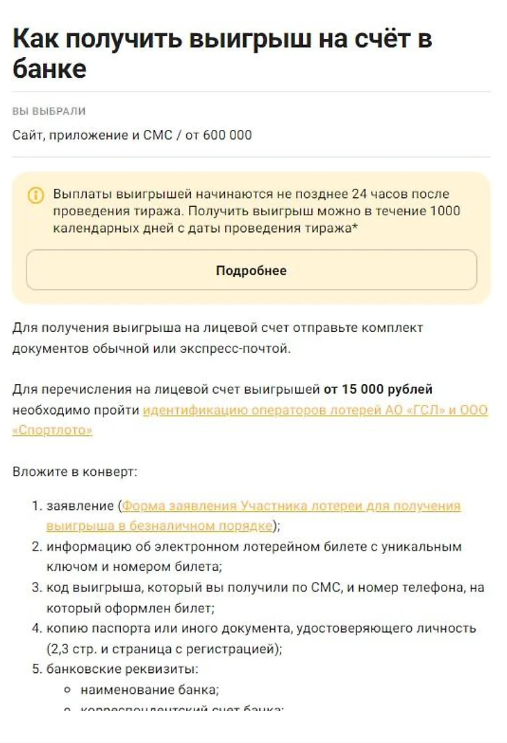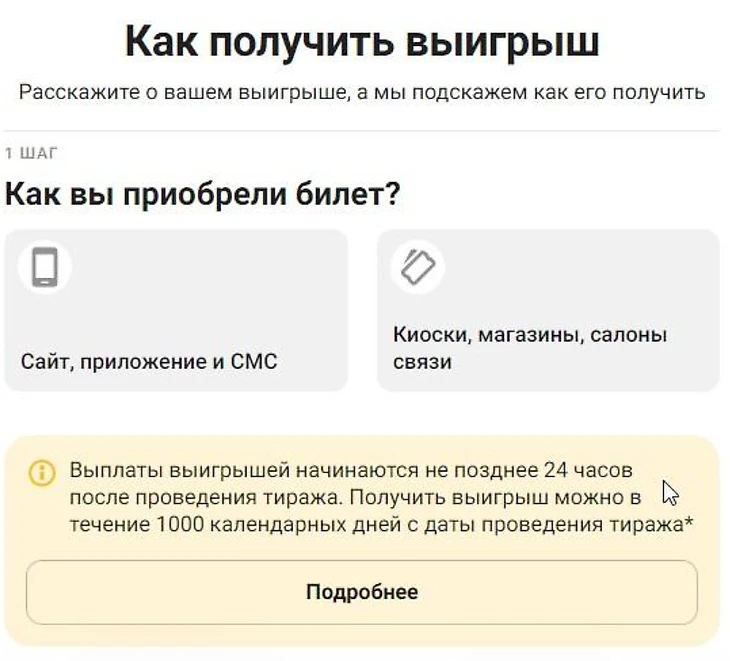 Все подробности можно узнать вы странице «Как получить выигрыш» (stoloto.ru/lottery-winning). Вам нужно выбрать способ покупки билета, указать сумму выигрыша и желаемый способ выплаты. Откроется подробная инструкция получения выигрыша согласно заданным параметрам.