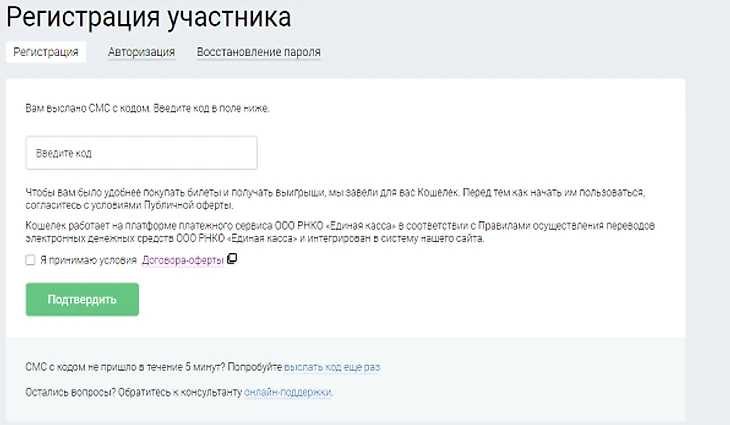 При выигрыше более 15 тыс. р. вы будете оповещены об этом при помощи смс-кода на номер телефона, указанный при регистрации. Если выигрыш составляет менее 15 тыс. р., можно заказать код отдельно.