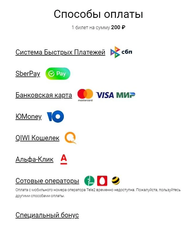 Для оплаты лотерейных билетов можно использовать карту VISA, кошелек «Столото» или другие платежные системы. Во вкладке «Все способы» вы увидите все доступные методы: помимо вышеперечисленных, это онлайн-кошельки QIWI и ЮMoney, интернет-банкинг, мобильная коммерция и специальные бонусы (начисляются за победы в викторинах и участие в акциях).