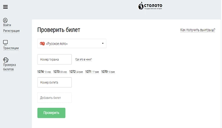 Если вы играли в лотерее по смс или без регистрации, но помните номер тиража, то можно проверить билет на сайте. Перейдите во вкладку «Проверка билетов» (в левом меню). Введите все данные купона и тиража и нажмите «Проверить».