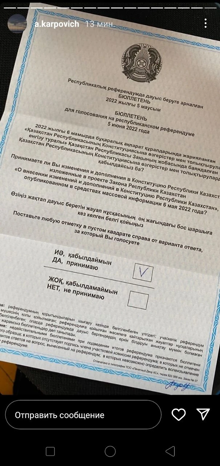 Карпович на своей странице опубликовал свой бюллетень, где он проголосовал «за» поправки в Конституцию.