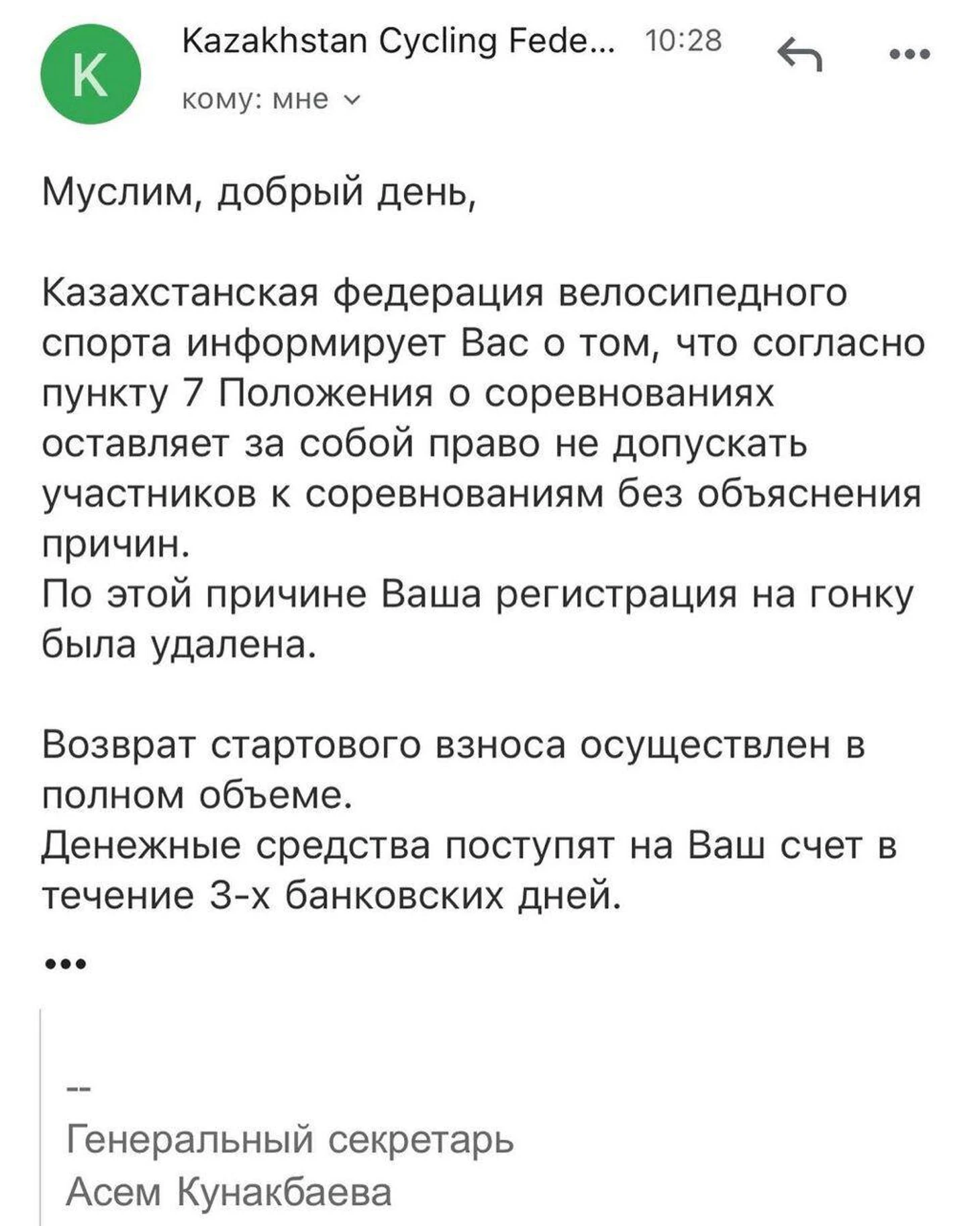 Вскоре, Муслим Сейтжанов получил письмо на почту от федерации велоспорта Казахстан, где сообщили о недопуске его на соревнования.