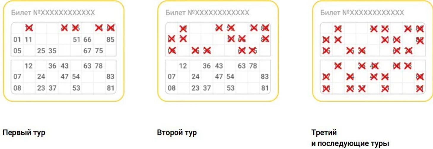 3-й и последующий туры – побеждают карточки, в которых раньше других совпадут все 30 чисел в обоих полях.