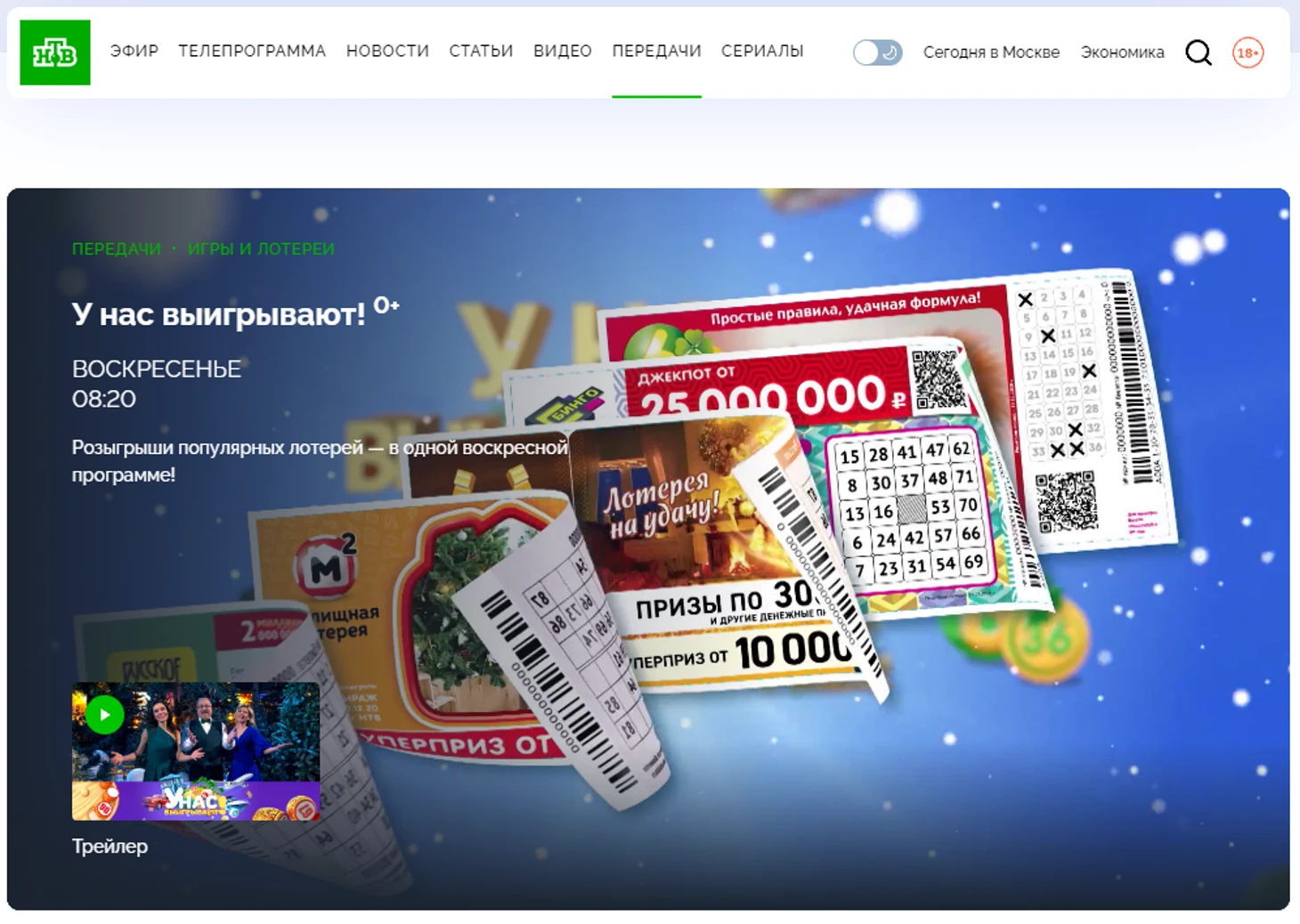 На картинке: промо передачи У нас выигрывают на сайте НТВ