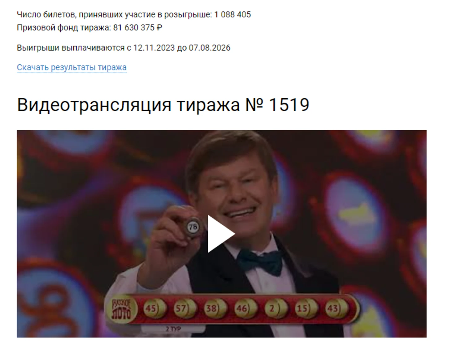 Как и в случае с YouTube каналом, на сайте «Столото» нельзя посмотреть прямую трансляцию розыгрыша «Русского лото». Трансляция доступна только на телеканале НТВ.