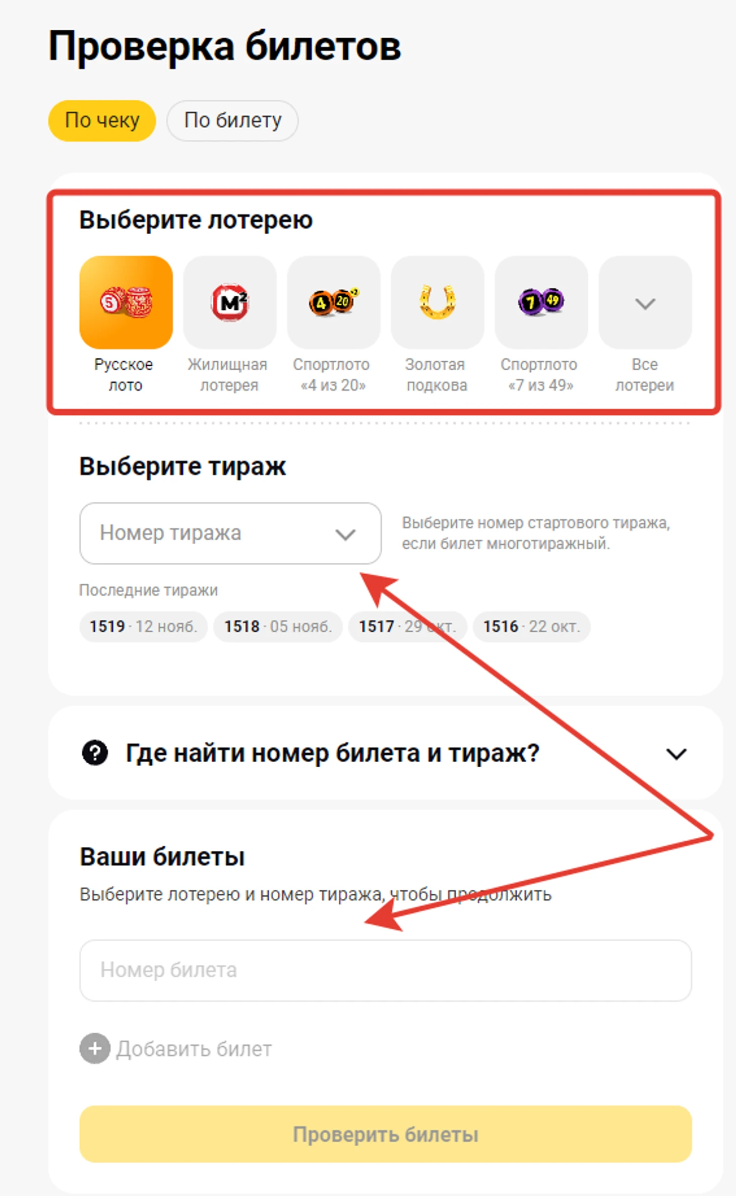 На картинке: раздел Проверка билетов на сайте Столото, красным выделен выбор лотереи, стрелки показывают поля для ввода номера тиража и билета