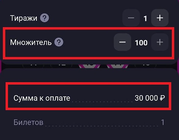 Страница оплаты билета лотереи «Рапидо». Выбран максимальный множитель х100. Цена билета – 30 000 рублей