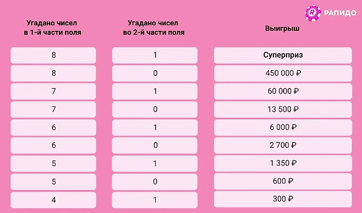 Таблица выигрышей в лотерее «Рапидо»