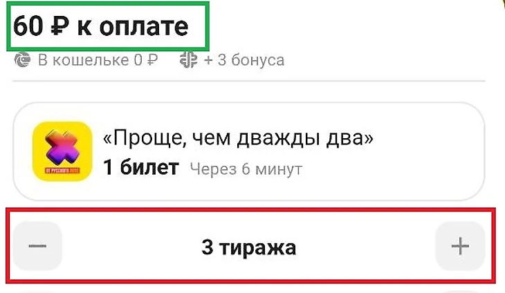 Страница оплаты билета лотереи «Проще, чем дважды два». Билет приобретается на 3 тиража (поле выделено красным цветом). Цена билета – 60 рублей (выделена зеленым)