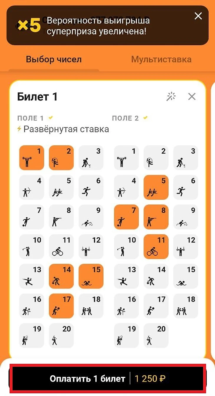 Билет Спортлото «4 из 20». В поле №1 (слева) выбраны 5 чисел, в поле №2 (справа) – 4. Цена билета указана внизу (1250 рублей), на кнопке «Оплатить» (выделена красным цветом)