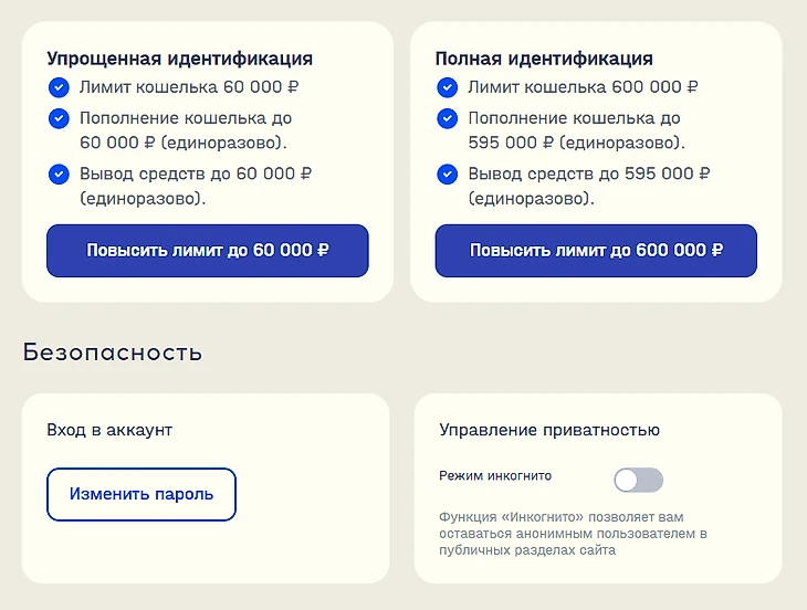 | лимит кошелька | 60 000 рублей | 600 000 рублей |