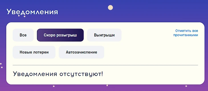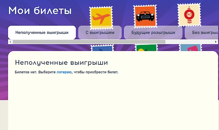 В разделе нельзя выбрать билеты по отдельным лотереям или временному интервалу.