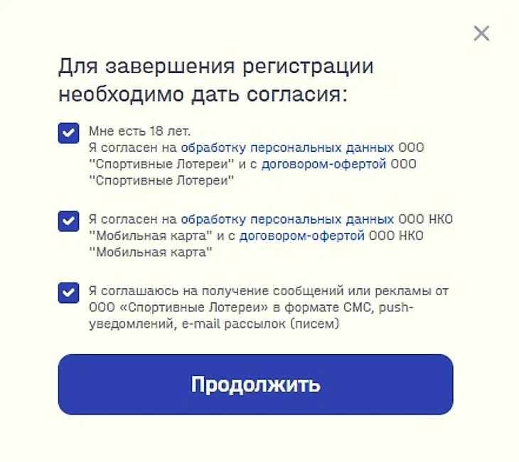 возраст 18+ и обработку персональных данных ООО «Спортивные лотереи»;