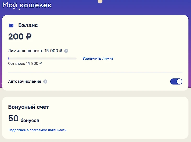 В разделе указан лимит, баланс и сумма, которая осталась до достижения ограничения. Пользователь может установить опцию автозачисления выигрышей. Если размер приза до 14 999 рублей, то выигрыш автоматически поступит на баланс кошелька. В кошельке также отображается баланс бонусного счета.