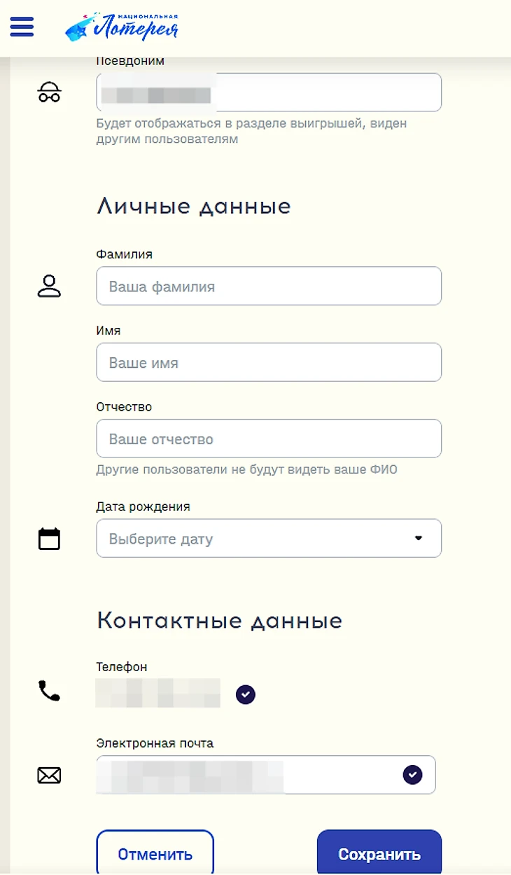 У «Национальной лотереи» нет отдельной формы для регистрации. Вход в учетную запись и регистрация происходят по коду из СМС-сообщения, которое приходит на указанный номер телефона. Такой формат на сайте и в мобильном приложении.