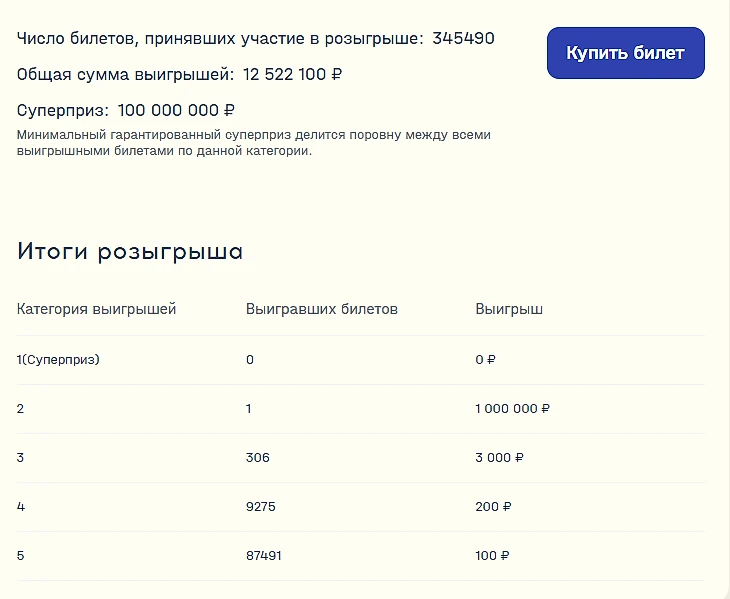Выбрав необходимый тираж, пользователь попадет на страницу с итогами розыгрыша. На ней будут указаны: