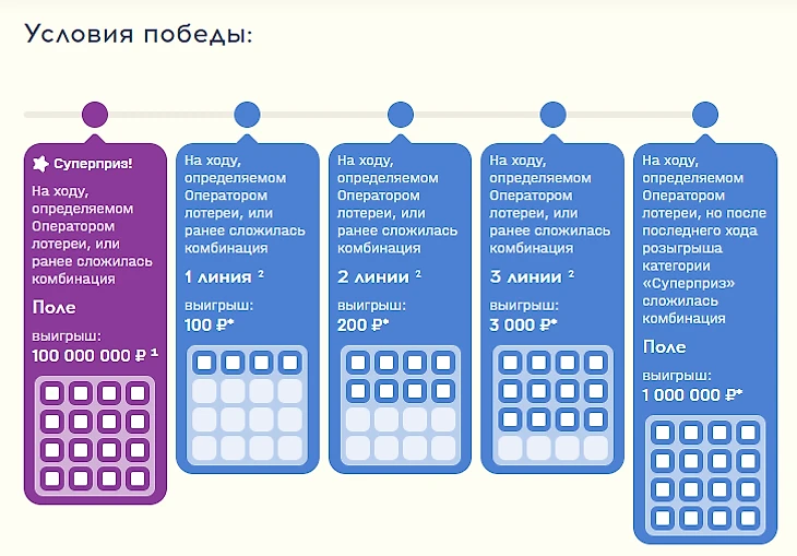 Если закрыть все игровое поле до хода, на котором заканчивается розыгрыш супер-приза, то вы станете обладателем 100 000 000 рублей. Если розыгрыш супер-приза окончен и на последующих ходах у вас закрылись все 16 чисел, то выигрыш составит 1 млн рублей.