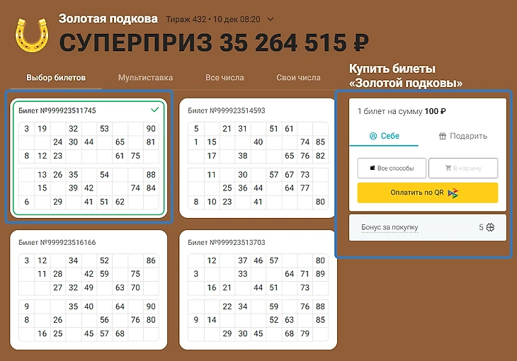 На картинке: билеты лотереи Золотая подкова, синим выделены выбранный купон и форма для перехода к оплате