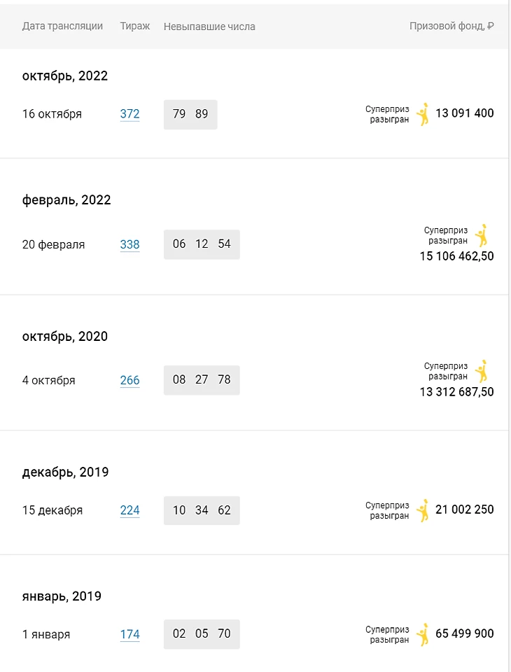 За последние 5 лет, с 6 декабря 2018 года по 6 декабря 2023 года было всего пять тиражей, в которых разыграли суперприз. Суперприз разыгрывается на пятом ходу. Вероятность победы 1 к 43 949 268.