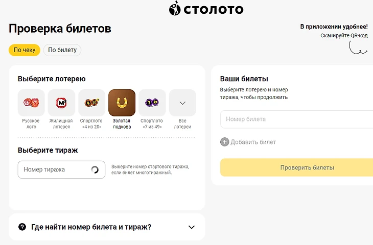 Далее можно указать номер тиража и номер лотерейного билета или ввести штрих-код. После ввода данных потребуется нажать «Проверить билеты».