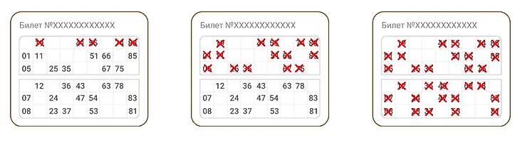 В первом туре выигрывают все билеты, в которых первыми закрылись пять чисел в любой горизонтальной строке билета. Во втором туре побеждают те билеты, в которых произошло закрытие верхнего или нижнего игрового поля. В третьем и последующих турах побеждают те, кто закрыл в купоне все 30 чисел.