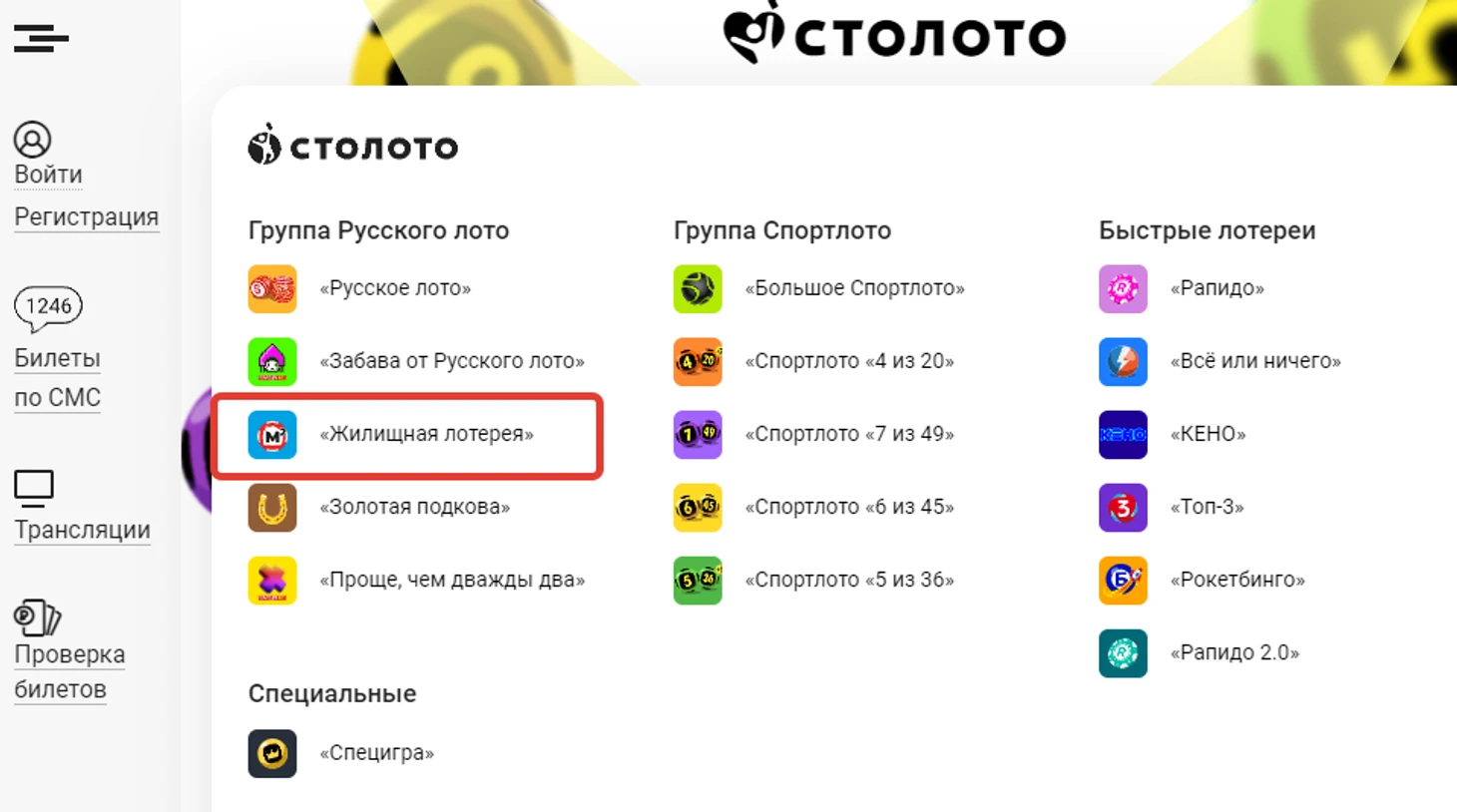 На картинке: общий список лотерей на сайте Столото, красным выделена Жилищная лотерея