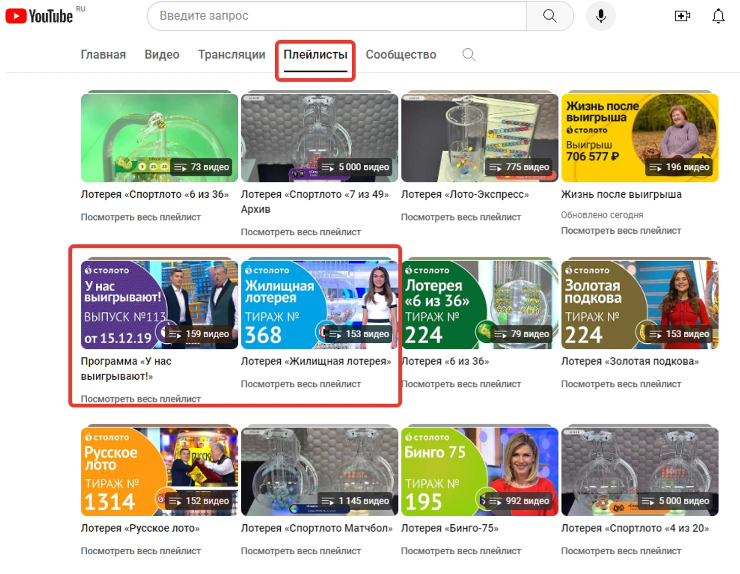 На главной странице видео представлены по времени добавления. Так как каждый день добавляется много видео, а «Жилищная лотерея» выходит всего один раз в неделю, то для быстрого поиска записи необходимо перейти в раздел «Плейлисты». В нем можно открыть плейлист с записью всех телепередач «У нас выигрывают!» или выбрать именно «Жилищную лотерею». В первом случае вы посмотрите все шоу, если есть такое желание. Во втором случае будет отрезок эфира именно с выбранной лотереей.