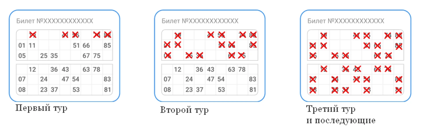 В зависимости от тура, призовыми комбинациями считаются закрытые 5 чисел в любой горизонтальной строке, 15 чисел одного из полей и 30 чисел всего билета.