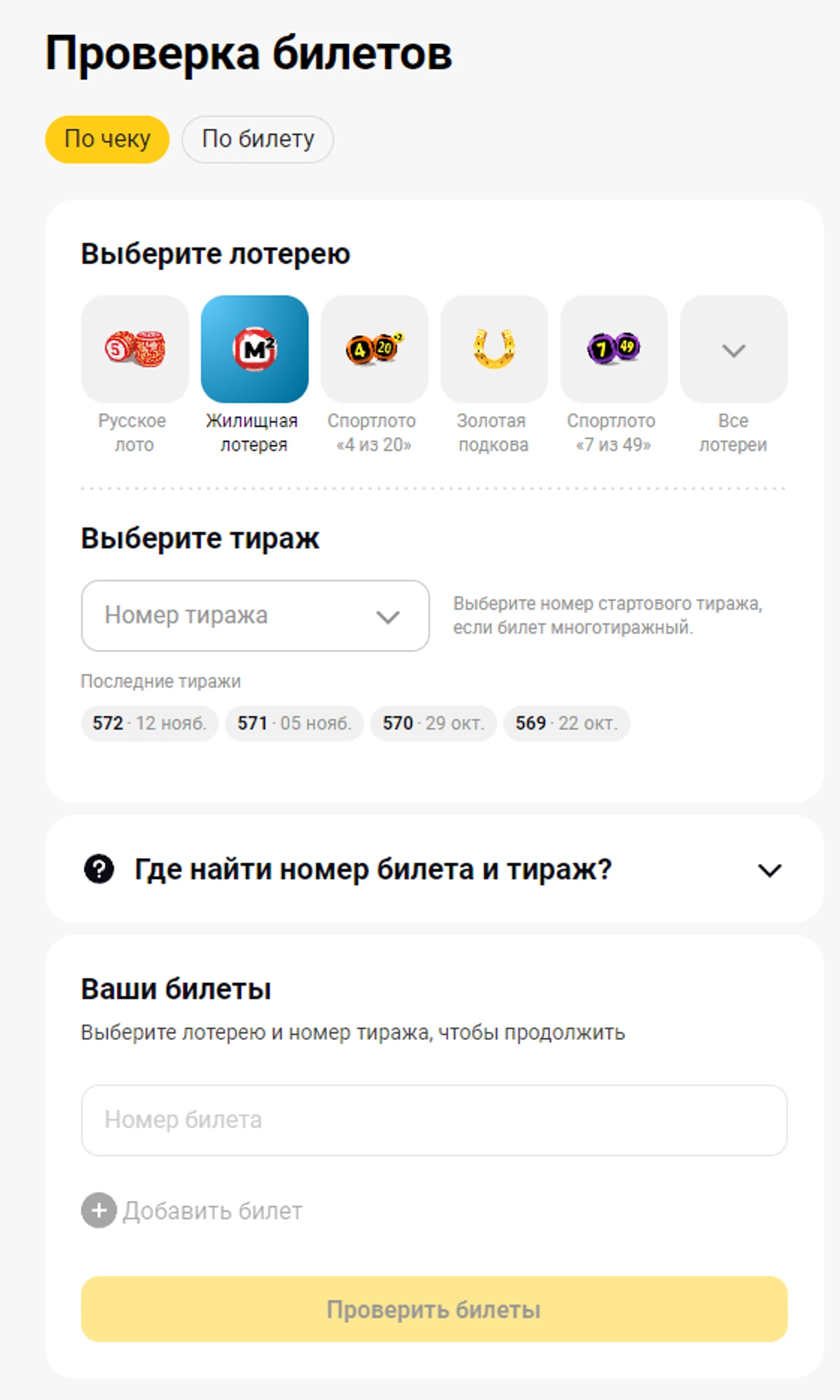 На странице проверки необходимо выбрать «Жилищную лотерею» из общего списка, указать номер тиража и билета, нажать кнопку «Проверка билета». Номер тиража и билета указаны на игровом купоне. Если вы выиграли, то на странице будет отображена информация о призе.