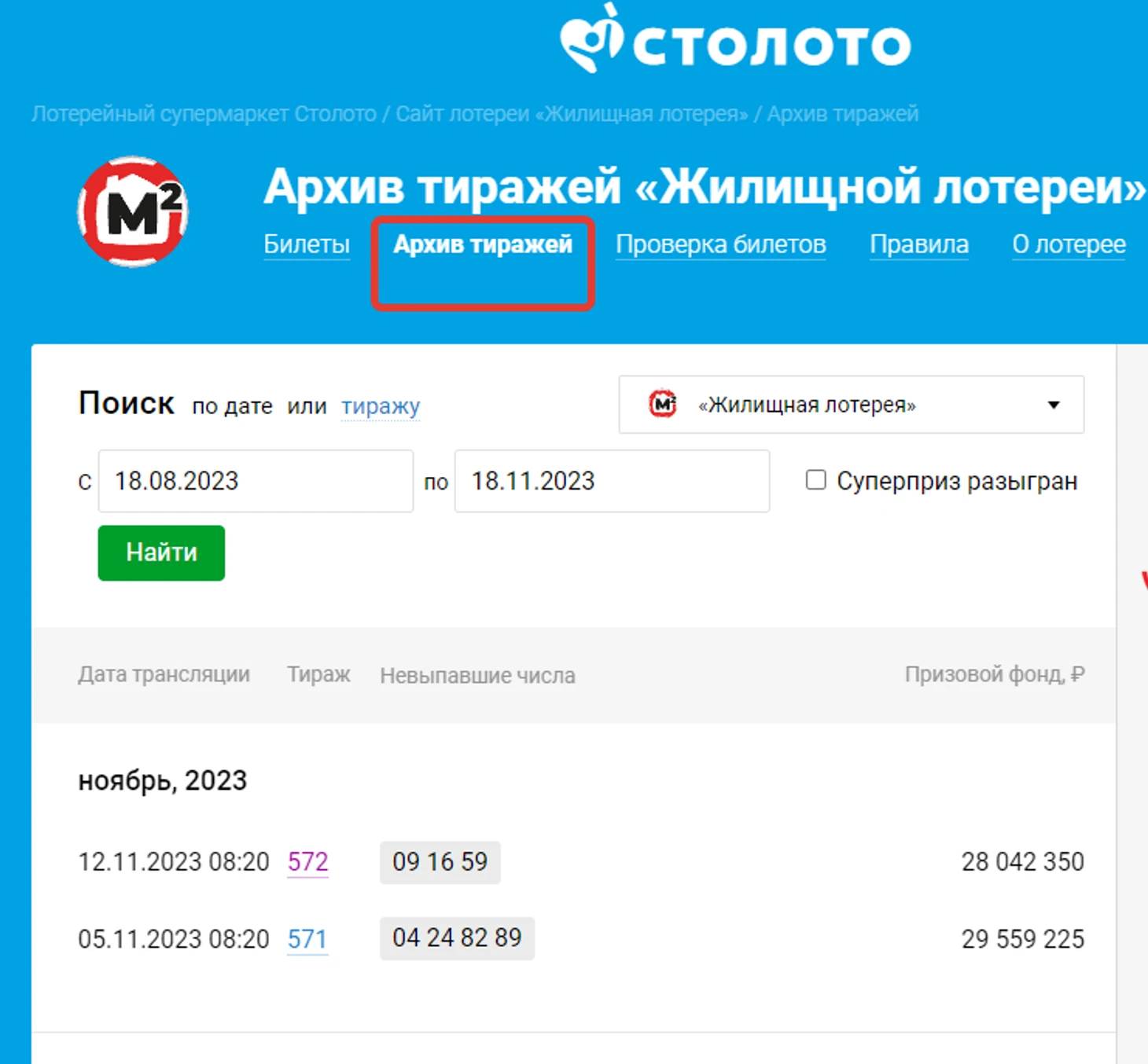 На картинке: раздел Архив тиражей на странице лотереи