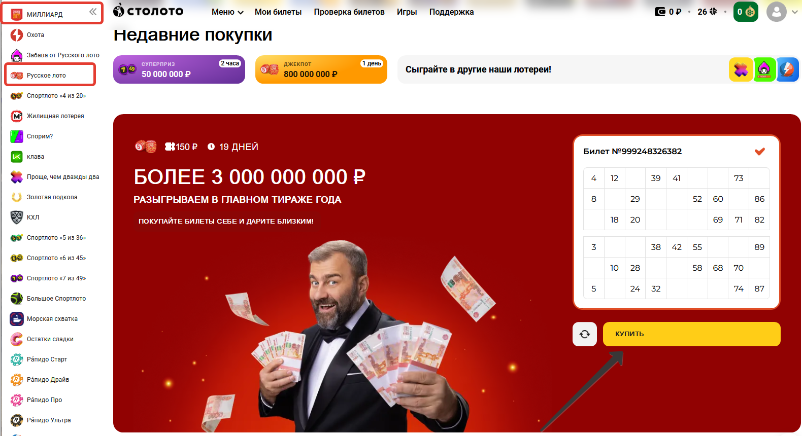 После авторизации на портале надо открыть список всех лотерей и выбрать «Русское лото». Вы можете перейти к тиражу с главной страницы «Столото», нажав на баннер лотереи.