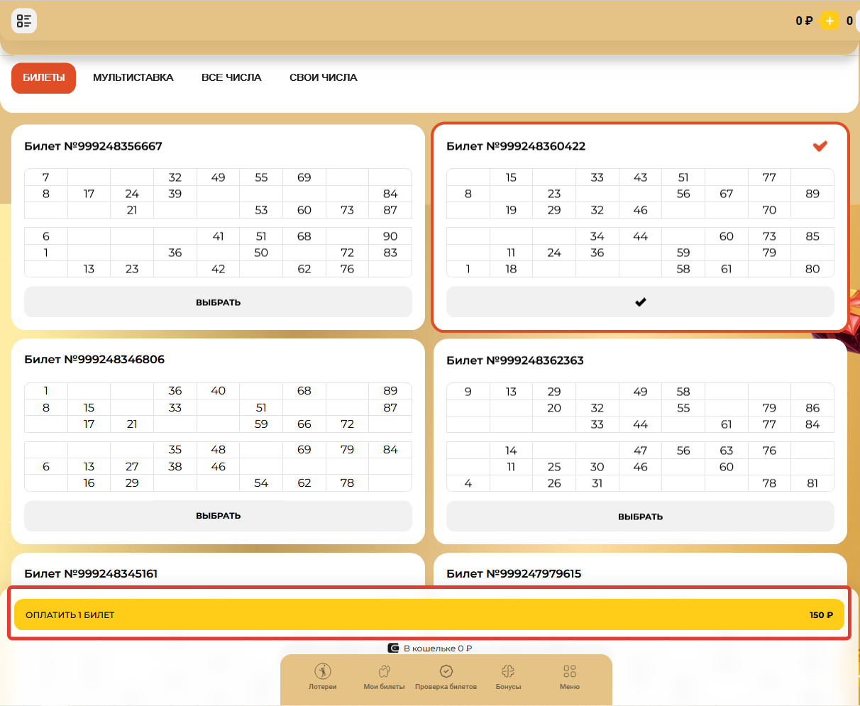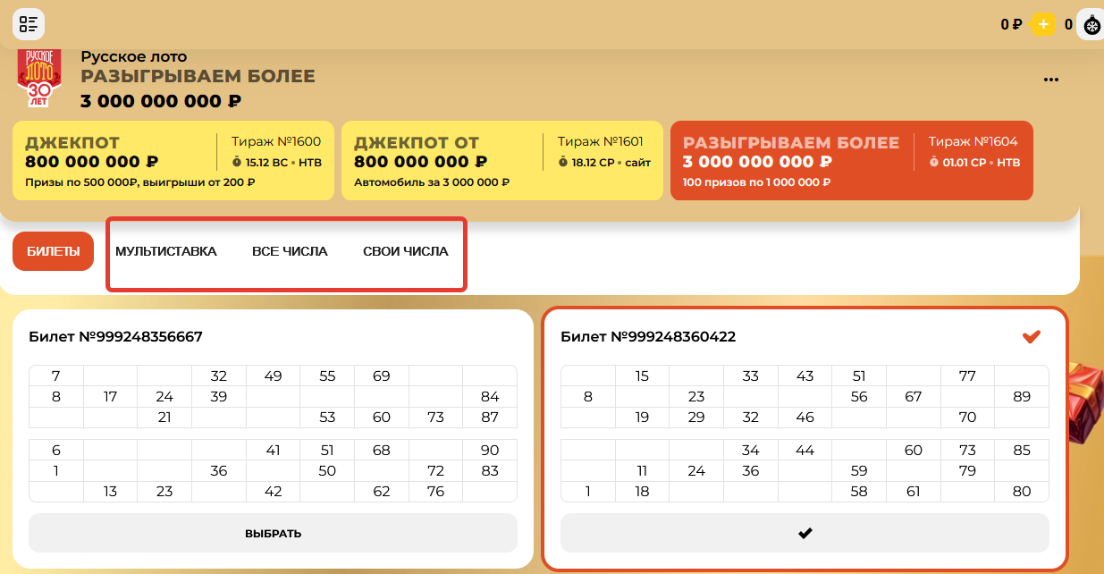 мультиставка — покупка от 1 до 300 билетов со случайной комбинацией на выбранный тираж;