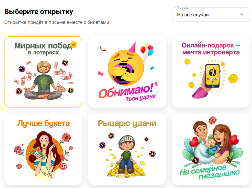На следующем этапе вы выбирайте открытку, которую отправите вместе с билетом. Есть возможность добавить сообщение. На момент выхода руководства, на «Столото» не представлены новогодние открытки. Выбрав открытку надо нажать «Далее».