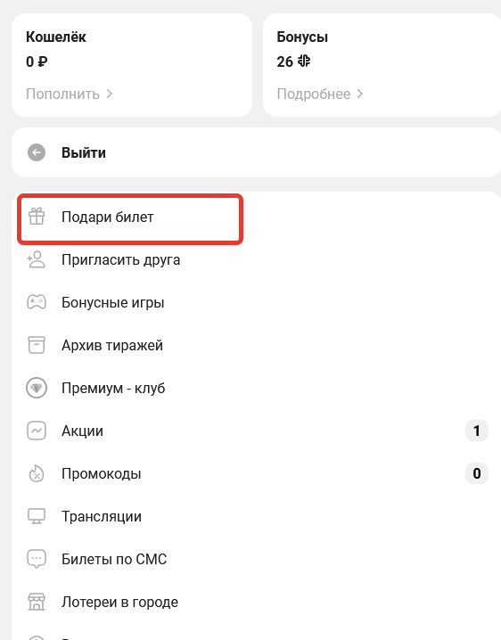 После регистрации на «Столото» вы можете подарить лотерейный билет. Для этого надо открыть меню сайта и выбрать раздел «Подари билет».
