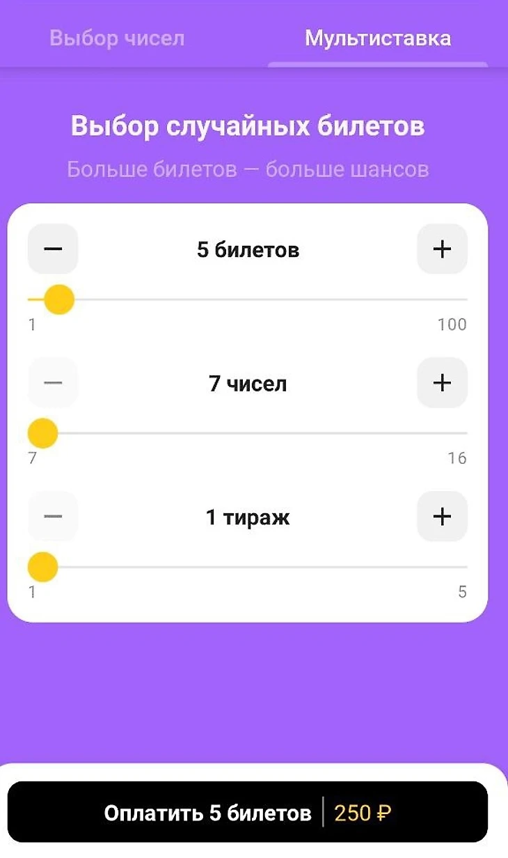 «Мультиставка». Благодаря этой функции игрок может приобрести несколько билетов с рандомными комбинациями чисел. Перейдите на вкладку «Мультиставка» на странице покупки купона и укажите количество билетов, чисел в каждом из них и тиражей. Система случайным образом сгенерирует билеты – вам останется только оплатить его.