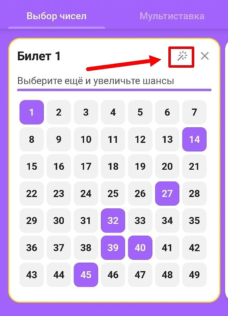 «Случайные числа». Нажмите на изображение волшебной палочки, чтобы позволить системе автоматически подобрать 7 цифр для вашего билета. Как знать, возможно, именно случайный выбор принесет вам миллионы!