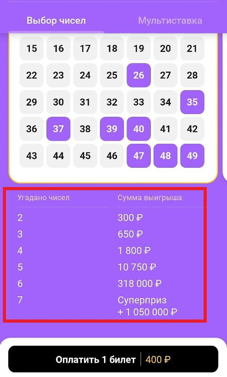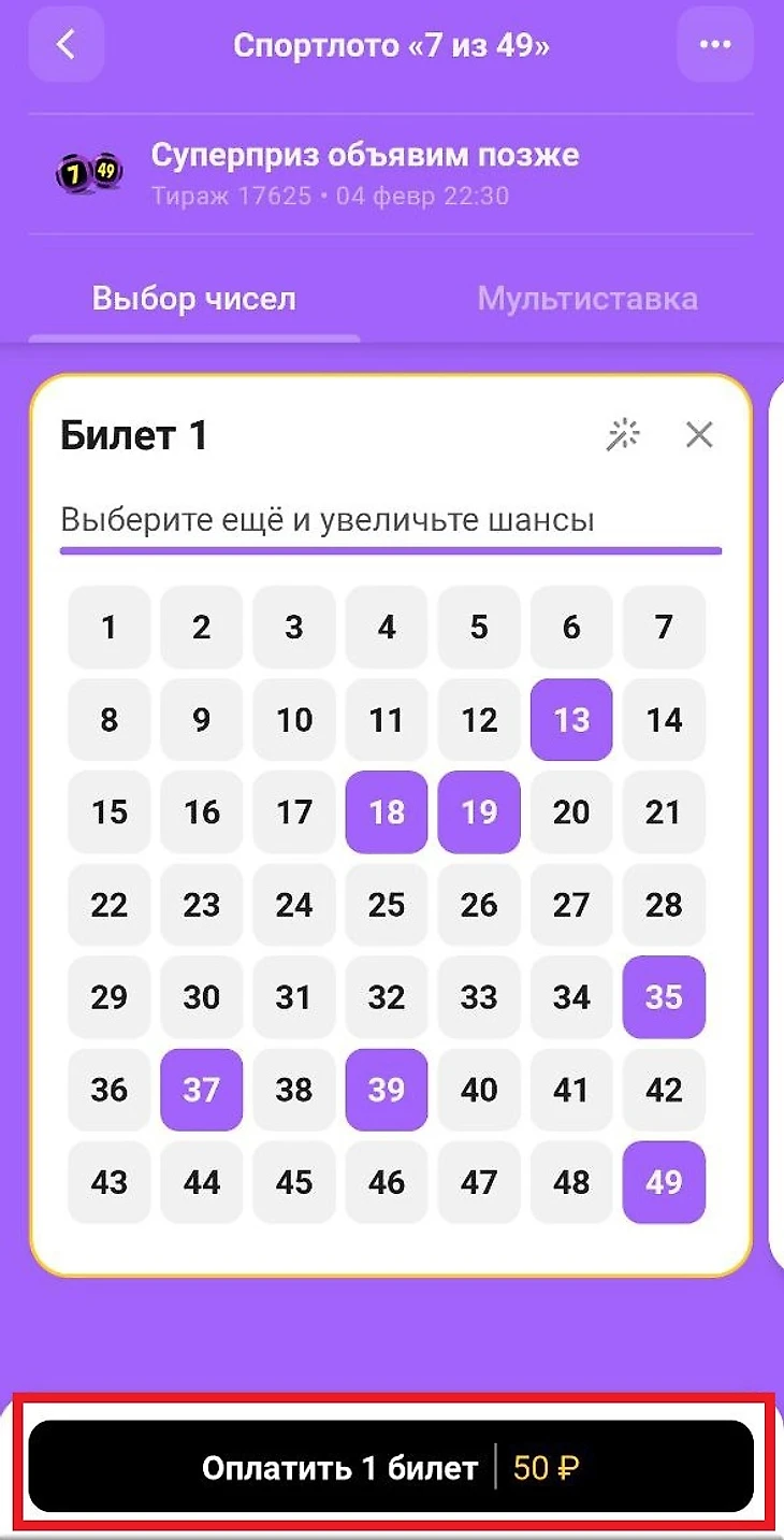 Игровая карточка лотереи «Спортлото «7 из 49»», в которой выбрано 7 чисел, внизу – кнопка для оплаты