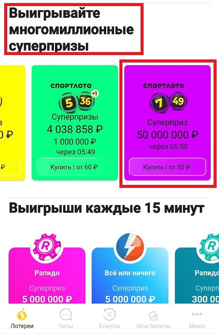Минимальная цена билета – 50 рублей за карточку с комбинацией из 7 чисел. Пошаговая инструкция, как купить билет «7 из 49» в приложении «Столото»: