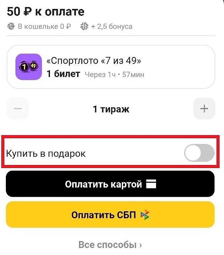 Выбор способа оплаты билета, выделен ползунок «Купить в подарок»